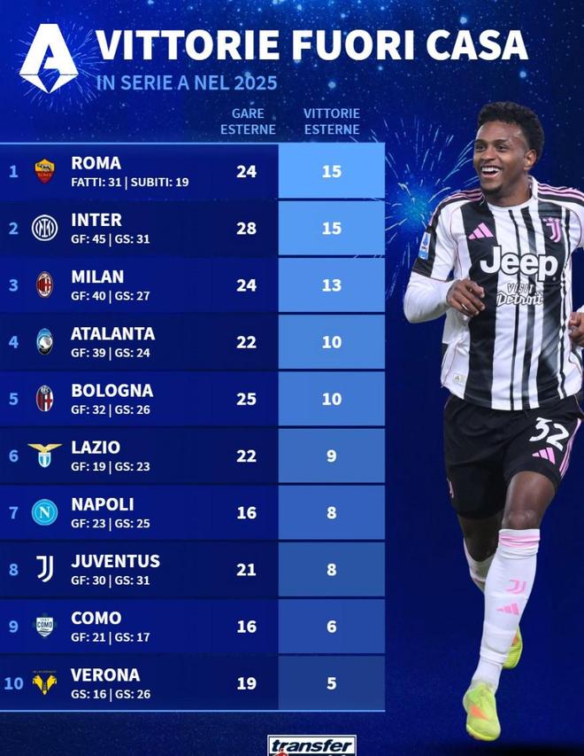 - 意甲球队2025年客场成绩:罗马、国米15胜第1,尤文21战仅8胜