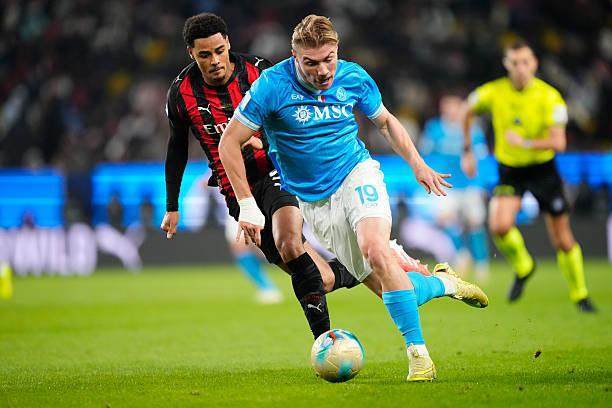霍伊伦的表演还没有结束。来到下半场,他再次接到斯皮纳佐拉从左侧的传球,再次在一对一场景中甩开德温特的贴身防守,随后用左脚瞄准球门远角,一记速度与精度兼具的射门,为那不勒斯扩大比分。他甚至在此后还有机会打入第三球,只是稍微偏出球门。霍伊伦有着出色的速度与冲击力,精于与队友配合,对球门充满渴望,即便在一些技术上还有提升空间,他显然是“现代中锋”的优秀代表,是适合这支那不勒斯的攻城槌。在他的冲击下,本场顶替加比亚出任居中后卫的德温特,在利雅得做了一场90分钟的噩梦。